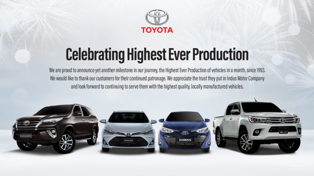 Indus Motor Company Limited was incorporated in December 1989 as a public limited company and listed on the Karachi Stock Exchange (now PSX) in 1992. It is a joint venture between the House of Habib (Pakistan), Toyota Motor Corporation, and Toyota Tsusho Corporation (Japan). Commercial production began in May 1993 at its state-of-the-art 109.5-acre manufacturing plant in Port Qasim, Karachi.