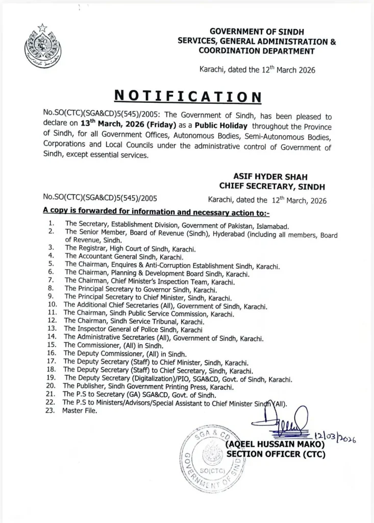 The Government of Sindh, through its Services, General Administration and Coordination Department, has officially declared Friday, March 13, 2026, as a public holiday. The holiday is observed in connection with Jumma-tul-Wida (the final Friday of the holy month of Ramadan) and Youm-al-Quds, a day of solidarity.